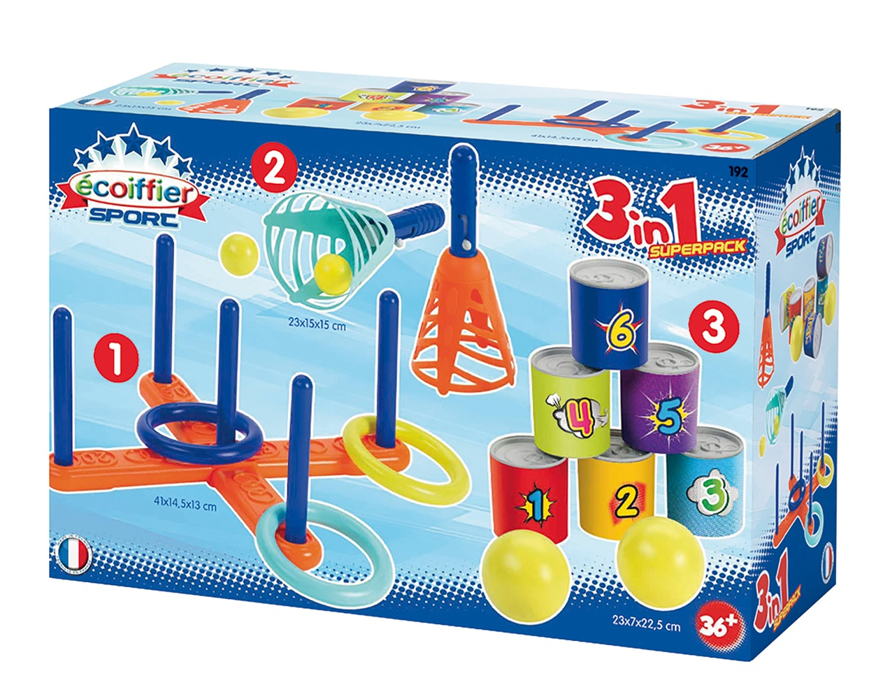 Ambiance kermesse pour ce pack contenant un chamboule tout de 6 boites de conserves et 2 balles, un jeu croix avec 3 anneaux et un jeu de 2 lance-balles avec 2 balles. Fabrication Française. Dès 36 mois. Origine France Garantie.