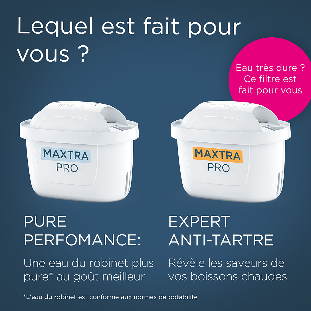 Les cartouches filtrantes BRITA MAXTRA PRO fournissent une eau du robinet plus pure* au goût agréable pour vos boissons froides et chaudes et protègent vos appareils ménagers (cafetière, bouilloire) de l'entartrage. C'est une alternative pratique et durable à l'eau en bouteille plastique à usage unique. Il existe 2 cartouches filtrantes BRITA MAXTRA PRO : la All-in-1** pour améliorer le goût de l'eau du robinet et l'Expert anti-tartre pour une protection supplémentaire contre le tartre : formule anti-tartre 50% plus puissante par rapport à MAXTRA PRO All-in-1**. Cette-dernière est idéale dans les régions où l'eau du robinet est dure à très dure. Soyez acteur du changement. Parce que chaque bouteille plastique à usage unique évitée compte. Avec BRITA, vous contribuez activement à réduire le nombre de bouteilles plastiques à usage unique qui finissent à la poubelle. 1 cartouche MAXTRA PRO permet de filtrer 150L d'eau et donc d’éviter jusqu’à 150 bouteilles plastiques à usage unique d’un litre. De plus, les cartouches filtrantes BRITA MAXTRA PRO, fabriquées à partir de 50% de matériau biosourcé, sont recyclables si rapportées dans un point de vente participant au programme de collecte BRITA. Pour en savoir plus, allez sur https://www.brita.fr/trouver-magasin. L'utilisation de matériau biosourcé joue un rôle essentiel dans la réduction de notre dépendance aux combustibles fossiles et contribue à réduire les émissions de CO2. BRITA, une expérience d‘hydratation durable depuis 1966. Qualité et design allemands. *Les visuels ne sont pas contractuels
