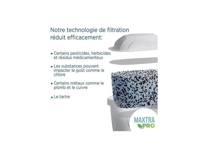 Les cartouches filtrantes BRITA MAXTRA PRO fournissent une eau du robinet plus pure* au goût agréable pour vos boissons froides et chaudes et protègent vos appareils ménagers (cafetière, bouilloire) de l'entartrage. C'est une alternative pratique et durable à l'eau en bouteille plastique à usage unique. Il existe 2 cartouches filtrantes BRITA MAXTRA PRO : la All-in-1** pour améliorer le goût de l'eau du robinet et l'Expert anti-tartre pour une protection supplémentaire contre le tartre : formule anti-tartre 50% plus puissante par rapport à MAXTRA PRO All-in-1**. Cette-dernière est idéale dans les régions où l'eau du robinet est dure à très dure. Soyez acteur du changement. Parce que chaque bouteille plastique à usage unique évitée compte. Avec BRITA, vous contribuez activement à réduire le nombre de bouteilles plastiques à usage unique qui finissent à la poubelle. 1 cartouche MAXTRA PRO permet de filtrer 150L d'eau et donc d’éviter jusqu’à 150 bouteilles plastiques à usage unique d’un litre. De plus, les cartouches filtrantes BRITA MAXTRA PRO, fabriquées à partir de 50% de matériau biosourcé, sont recyclables si rapportées dans un point de vente participant au programme de collecte BRITA. Pour en savoir plus, allez sur https://www.brita.fr/trouver-magasin. L'utilisation de matériau biosourcé joue un rôle essentiel dans la réduction de notre dépendance aux combustibles fossiles et contribue à réduire les émissions de CO2. BRITA, une expérience d‘hydratation durable depuis 1966. Qualité et design allemands. *Les visuels ne sont pas contractuels