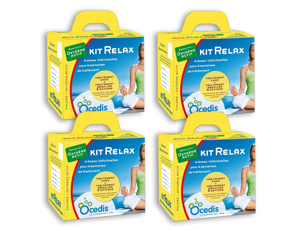 Ocedis KIT RELAX permet d'obtenir sans effort une eau cristalline, pure et saine. Le kit est composé de Force 5 à base de chlore stabilisé et l'Oxytab à l'oxygène actif. Une dose par semaine : désinfection, action anti-algue, action clarifiante, action stabilisante. Une boite = 1 mois de traitement.