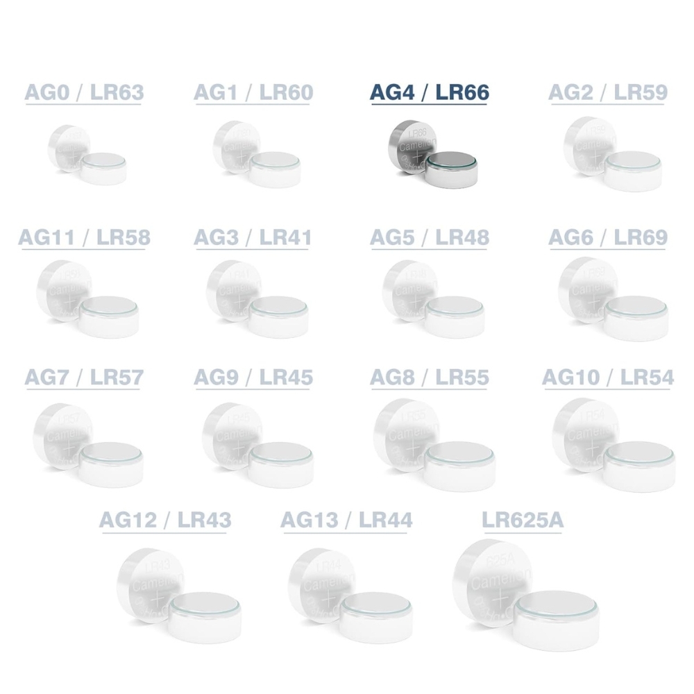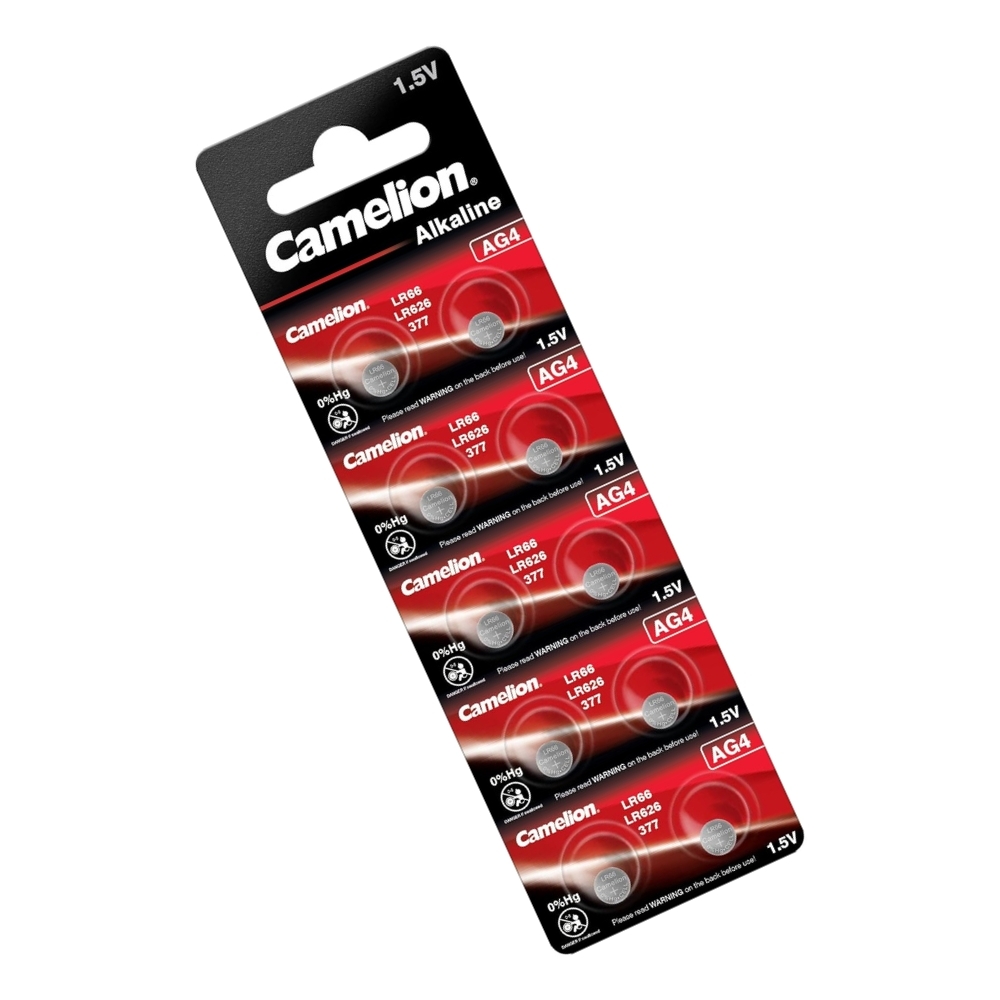 Pack de 10 piles Camelion Alcaline AG4 0% Mercury/HgCaracteristiquesType de pile AG5 LR 48 Dimensions (? x H mm) 7,9 x 5,4 Poids (g) 0,86 Capacité nominale 53mAh à 0,9V (20° ± 2° C 1,0k? en charge continue) Pack de 10 piles