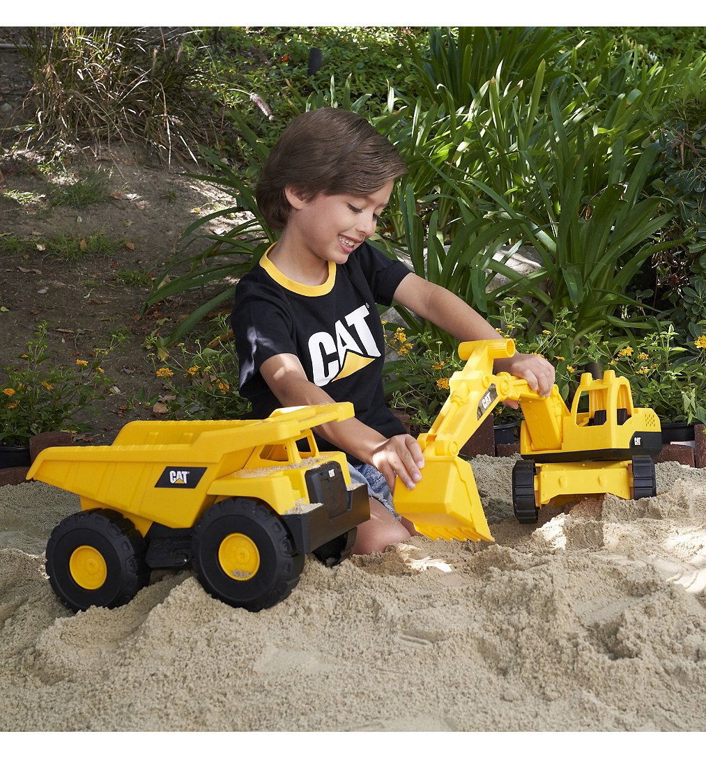 Pack de 2 véhicules chantier 38 cm sous licence CAT. Comprend 1 camion Benne 38 cm à benne basculante plastique sous licence CAT et 1 excavatrice 38 cm plastique articulée 38 cm. A partir de 3 ans. Dimensions du pack: 75 x 20 x 20 cm