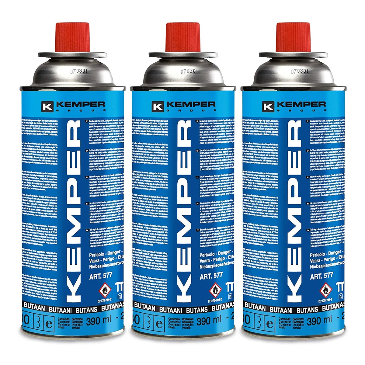 Pack de 3 bouteilles de gaz 220 g butane KEMPER UN2037 STANDARD. Idéales pour réchauds et appareils fonctionnant au gaz pour jardin, lampes de camping, chalumeaux et équipement de camping.