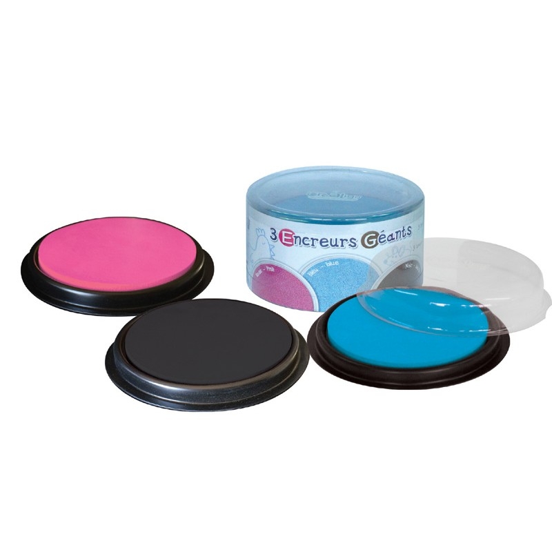 Lot de 3 tampons encreurs géants ronds, de 3 couleurs différentes : bleu, rose, noir.
