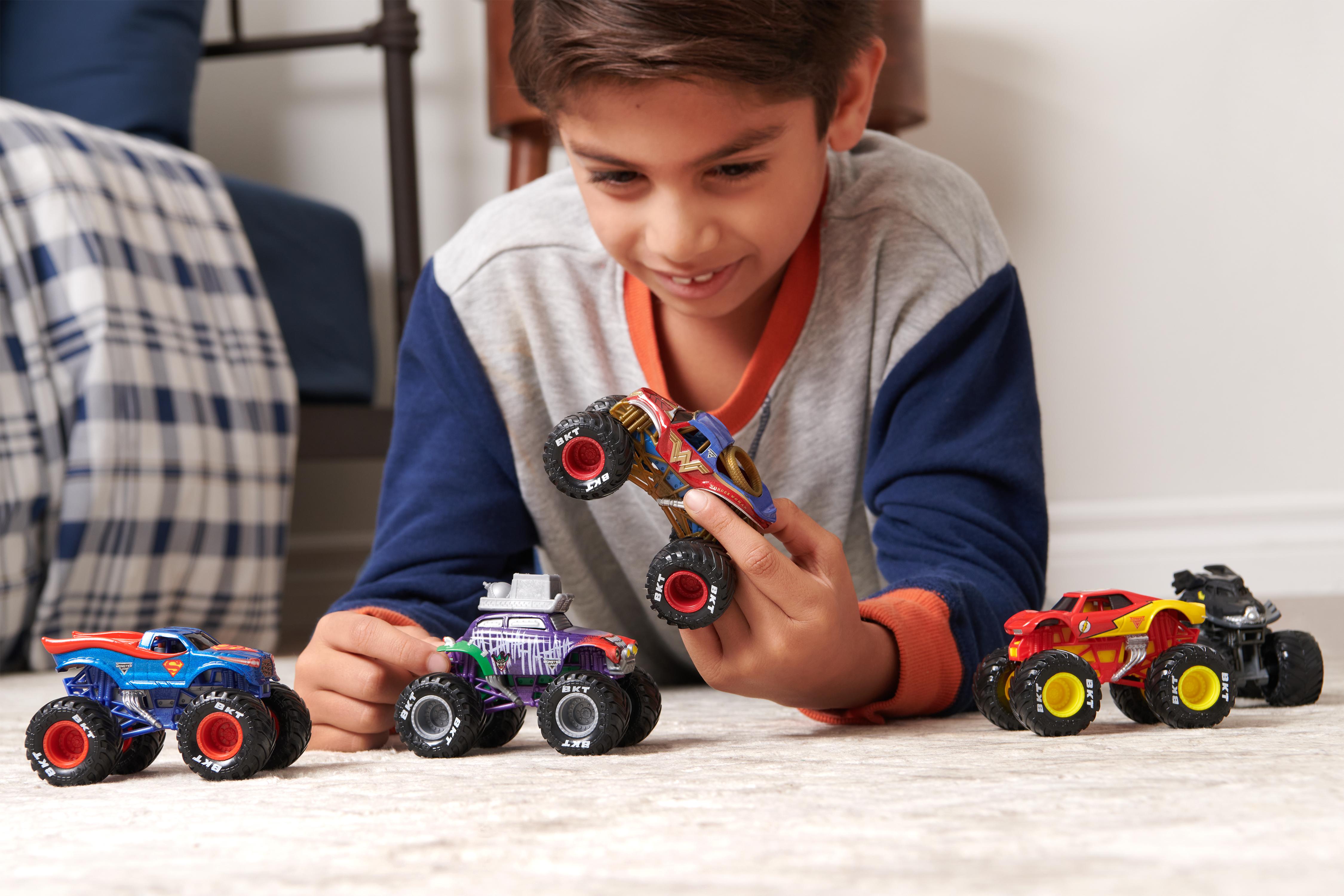 Les voitures officielles du show Monster Jam aux couleurs des personnages DC Comics. Un coffretde 5 véhicules Monster Trucks comme dans les spectacles Monster Jam avec les super-héros de la Justice League : Batman, Superman The Flash et Wonder Woman ainsi que du terrible Joker. Les véhicules hyper détaillés et fidèles aux héros du show avec un look agressif et de vraies suspensions pour jouer à faire le plein de cascades. Roues souples et ponts croisés pour franchir tous les obstacles, comme les vrais. Echelle 1/64e. Boîte fenêtre A partir de 3 ans.