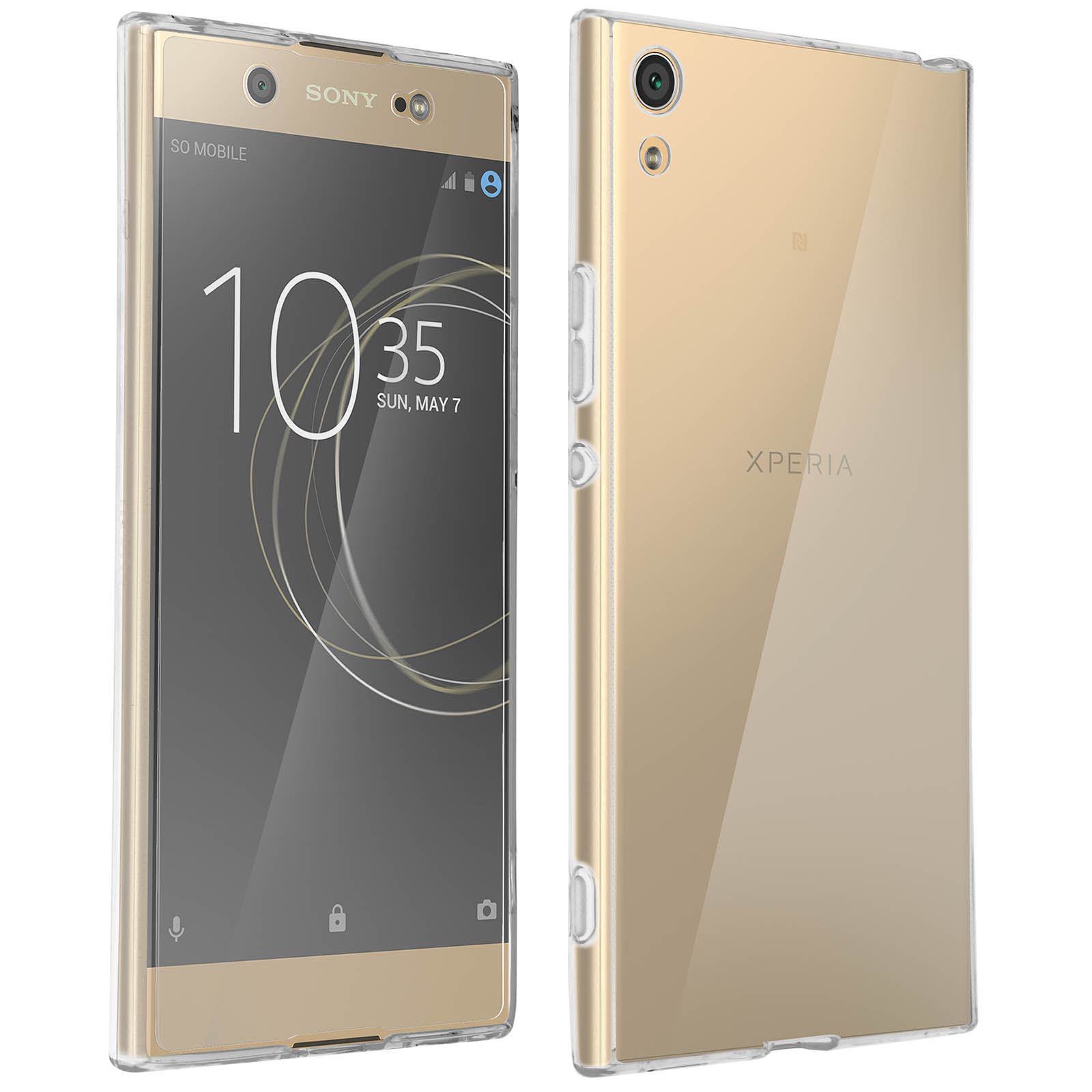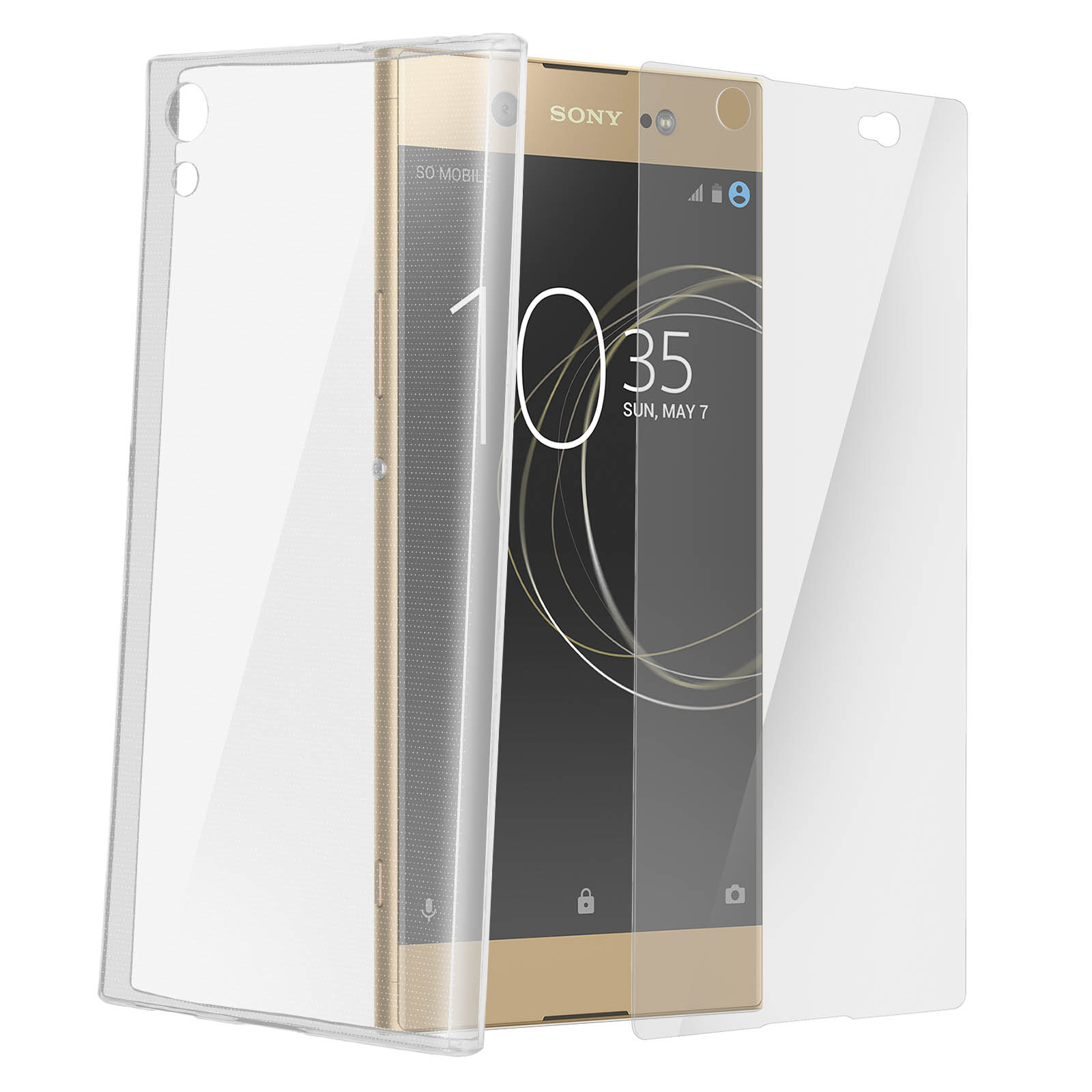 Pack de protection intégrale composé d'une coque arrière en silicone transparent et d'un vitre pour écran en verre trempé pour Sony Xperia XA1 Ultra.