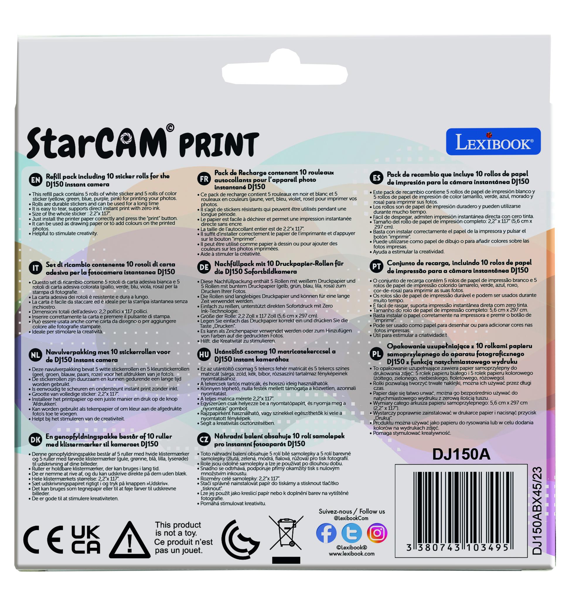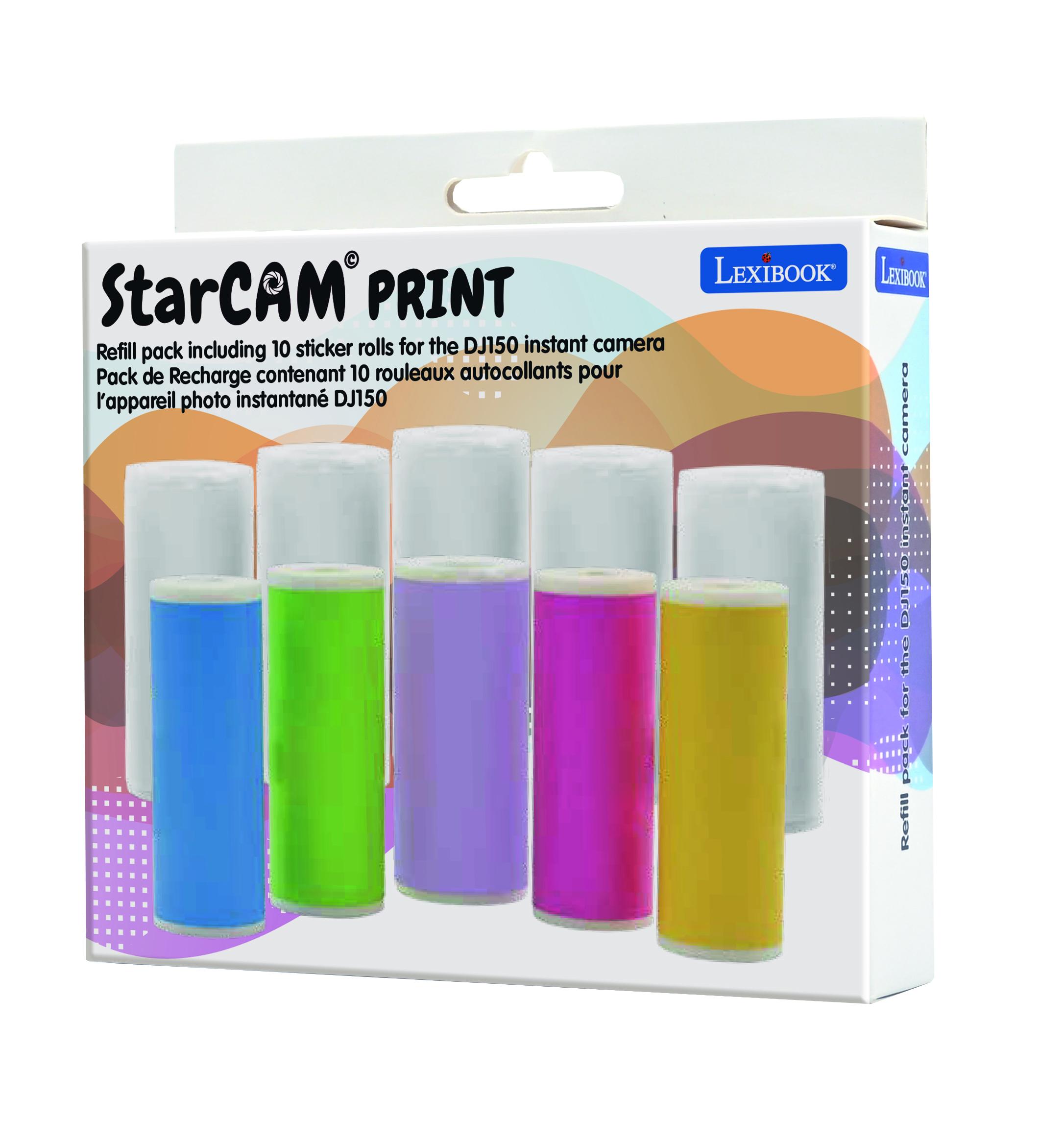 Pack de recharge contenant 10 rouleaux autocollants pour les r�f�rences Star Cam DJ150 et DJ160 * Ce pack de recharge contient 5 rouleaux en noir et blanc et 5 rouleaux en couleurs (jaune, vert, bleu, violet, rose) pour imprimer vos photos. * Il s�agit de stickers r�sistants qui peuvent �tre utilis�s pendant une longue p�riode. * Le papier est facile � d�chirer et permet une impression instantan�e directe sans encre. * La taille de l�autocollant entier est de 2.2�x 117�. * Il suffit d'installer correctement le papier de l'imprimante et d'appuyer sur le bouton "imprimer". * Il peut �tre utilis� comme papier � dessin ou pour ajouter des couleurs sur les photos imprim�es. * Aide � stimuler la cr�ativit�.