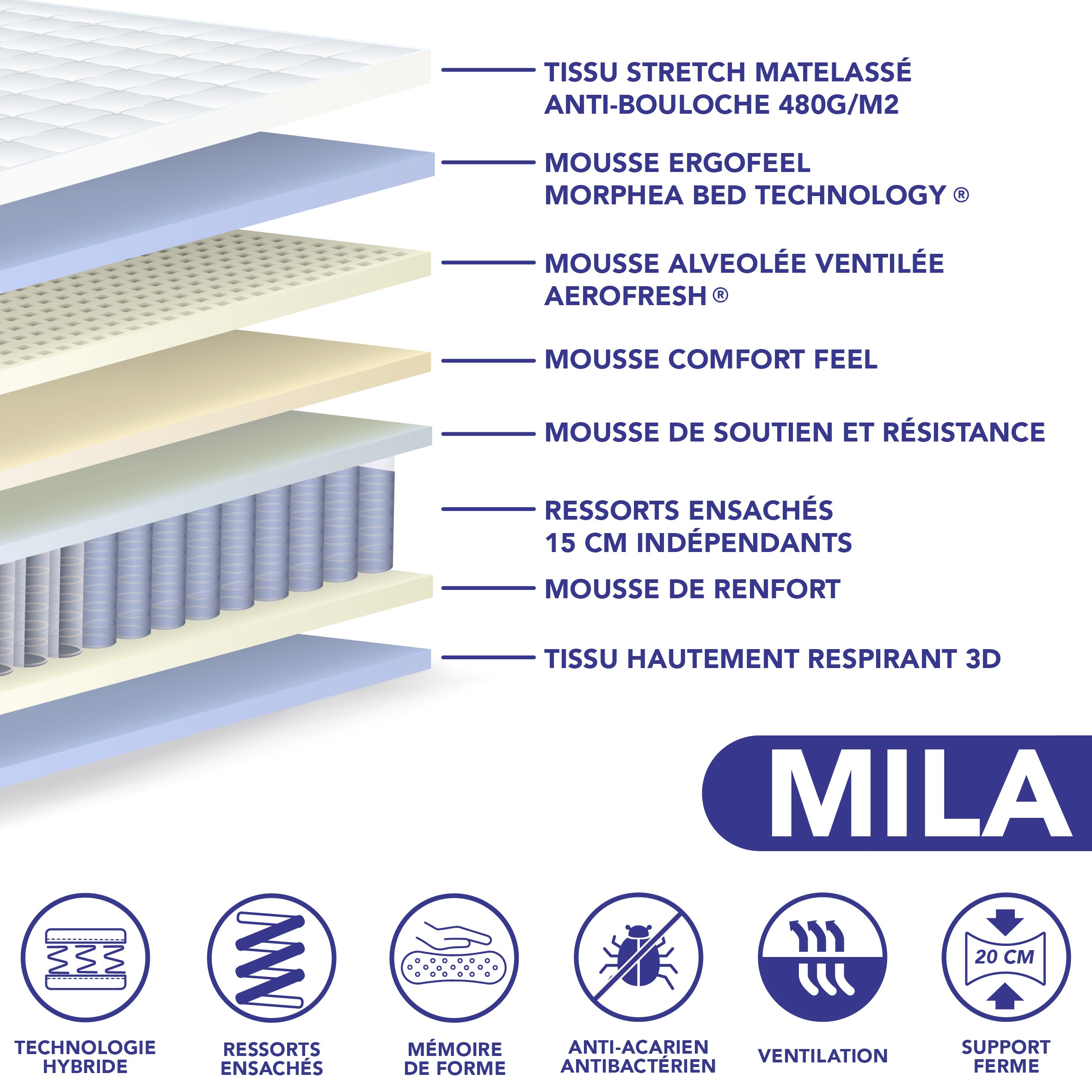 - Technologie hybride : combinaison de mousse à mémoire de forme Air Memory® et de ressorts ensachés de 22 cm pour une indépendance de couchage maximale.