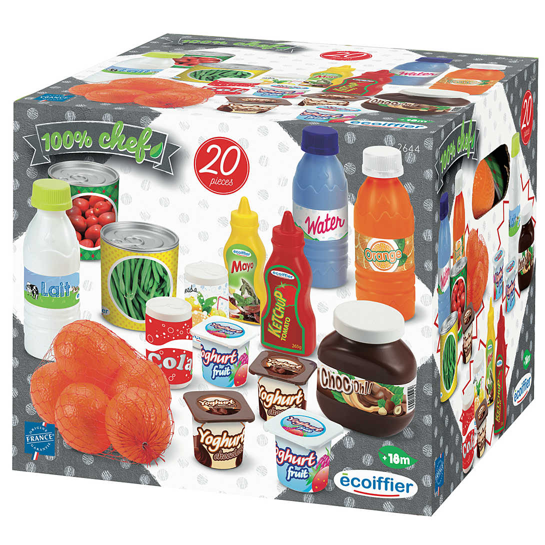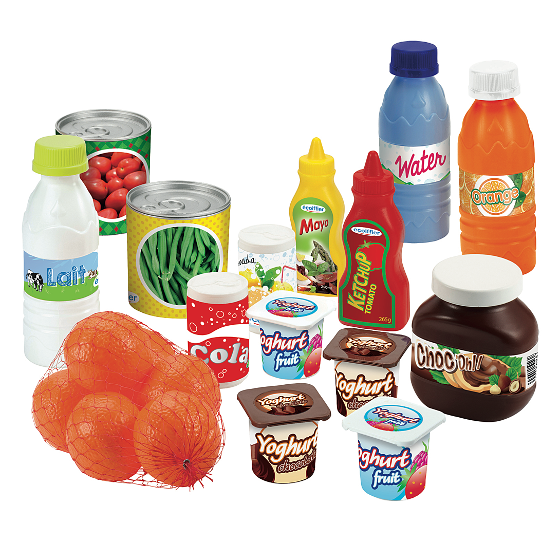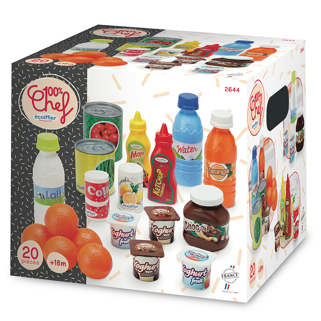 Ce pack contient l’essentiel des provisions : 1 bouteille d’eau, 1 bouteille de jus d’oranges, 1 bouteille de lait, du ketchup, de la mayonnaise, 2 boites de conserve, 1 pot de pâtes à tartiner, 4 yaourts, 2 sodas et 6 oranges. Recommandé dès 18 mois. Origine France Garantie.