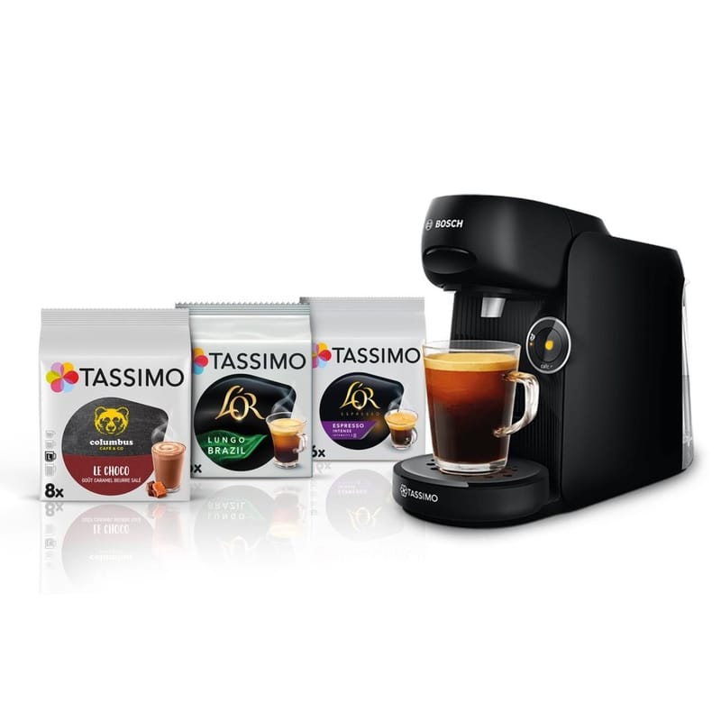 | Accessoires inclus | Cafetière Tassimo Bosch Finesse+ et 3 packs T-Disc (Columbus Le Choco, L'OR Lungo Brazil, L'OR Espresso Intense) |