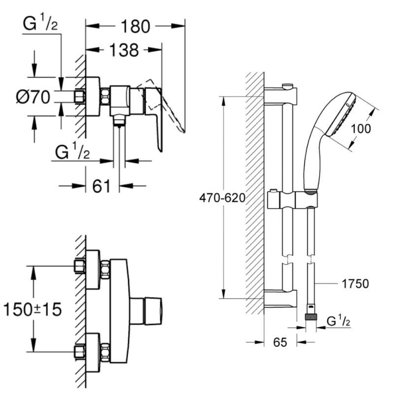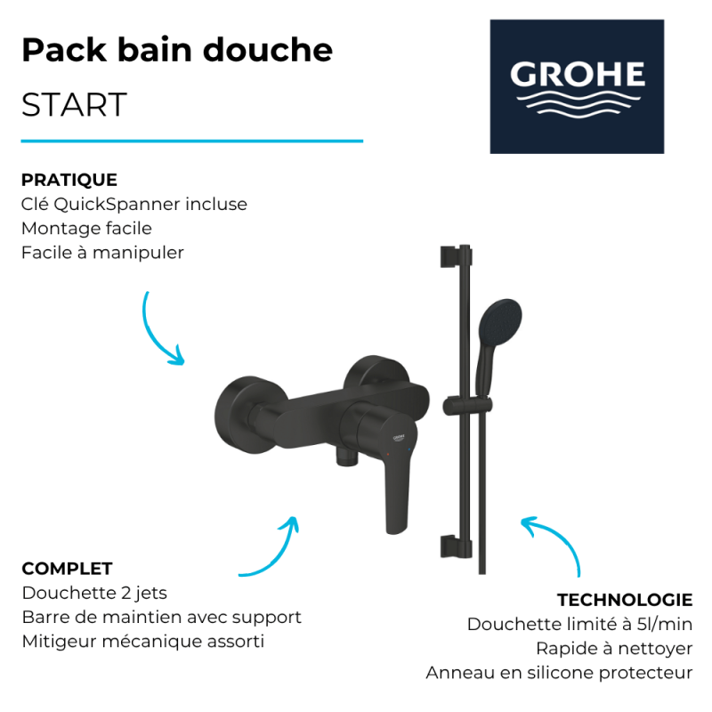| Libellé | Pack mitigeur douche mécanique GROHE Start noir + ensemble de douche GROHE Vitalio Start |
