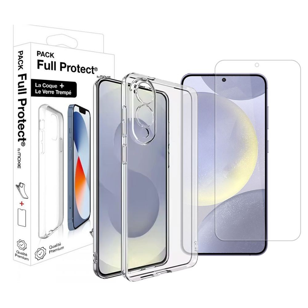 Pack Full Protect Moxie conçu pour le Samsung Galaxy S25 Fe : une coque TPU souple ultra-fine offrant haute transparence et grip, associée à une protection d'écran en verre trempé 2.5D pour préserver l'affichage des chocs et rayures. Le verre propose un toucher agréable et un traitement oléophobique pour limiter les traces de doigts.