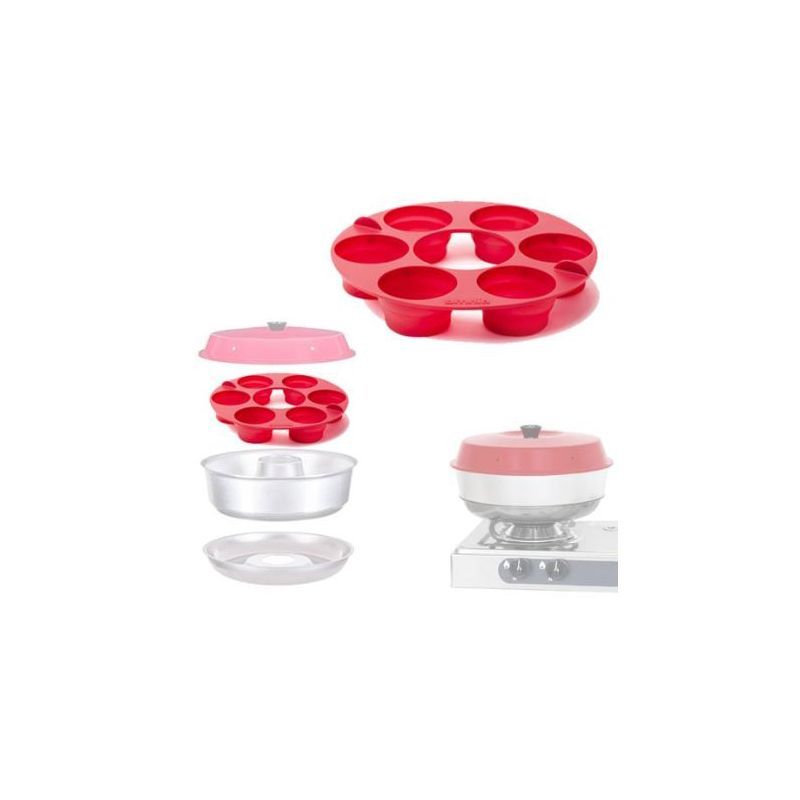 Il est constitué de 3 éléments : un châssis en inox SS430 robuste avec un trou central, un moule de 2 litres en aluminium de 25 cm de diamètre, également troué en son centre, et un couvercle en aluminium.