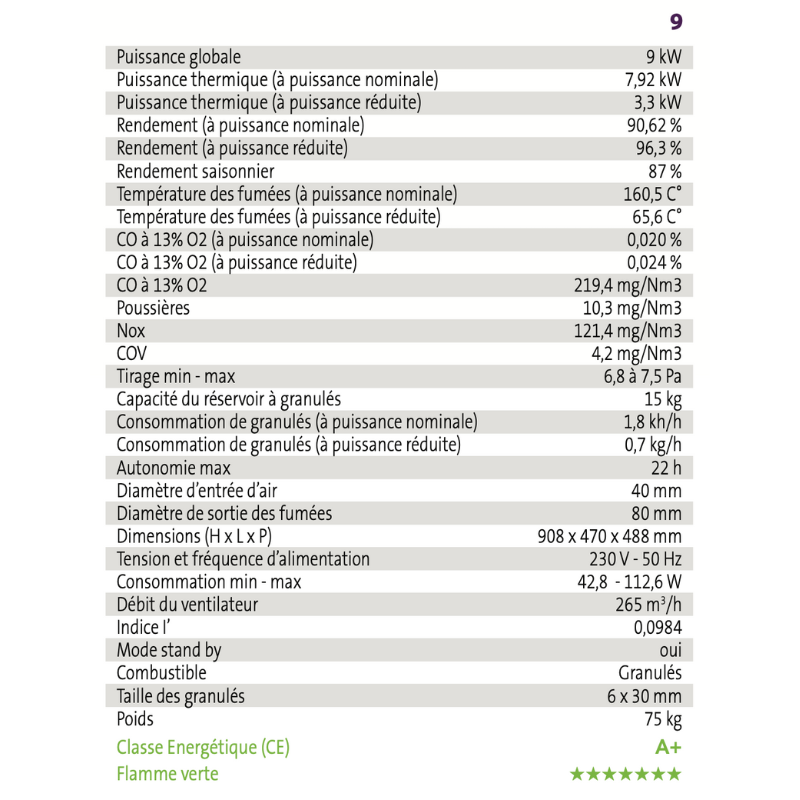 Le LEANDRO 9 étanche, flamme verte et éco design de fabrication italienne a un très haut rendement (95.90%)