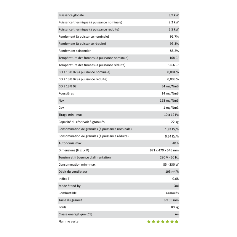 | Norme ou certification | Flamme verte 7 étoiles |
