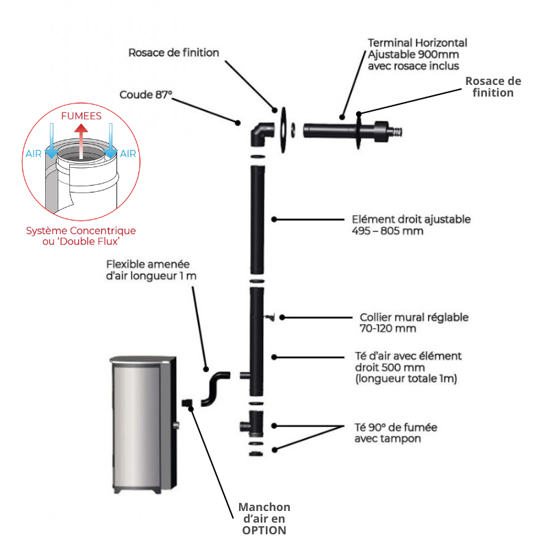 | Libellé | Pack Poêle à granulés ZARA 9 Etanche + Kit Conduit Ventouse (sortie façade) - Bordeaux |