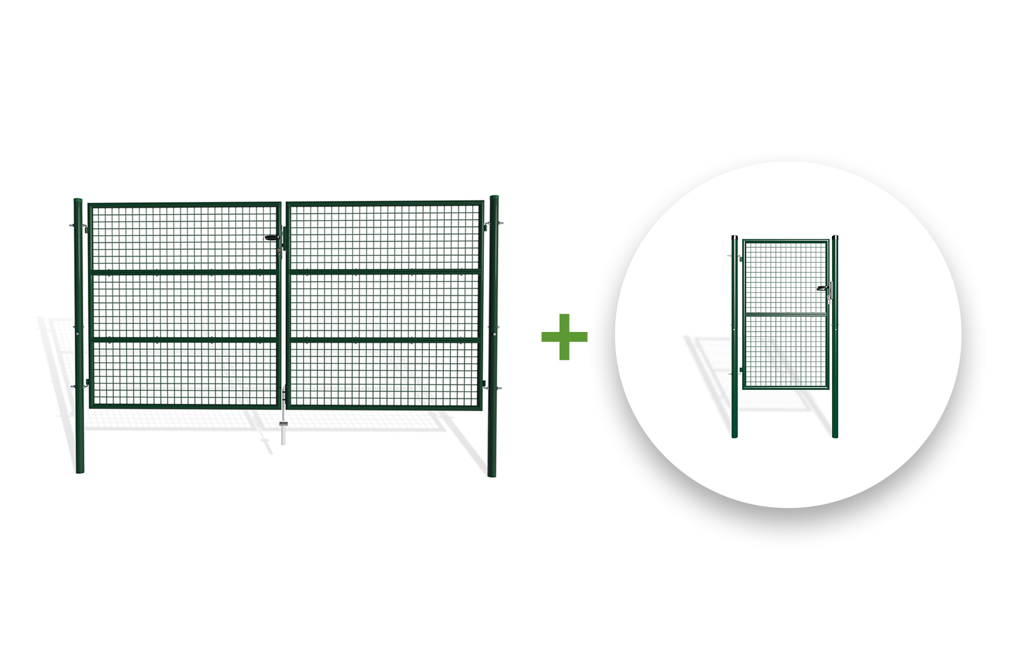 Pack portail battant grillagé OLGA 300B150 + Portillon 1m VERT, avec poignée, serrure et clé