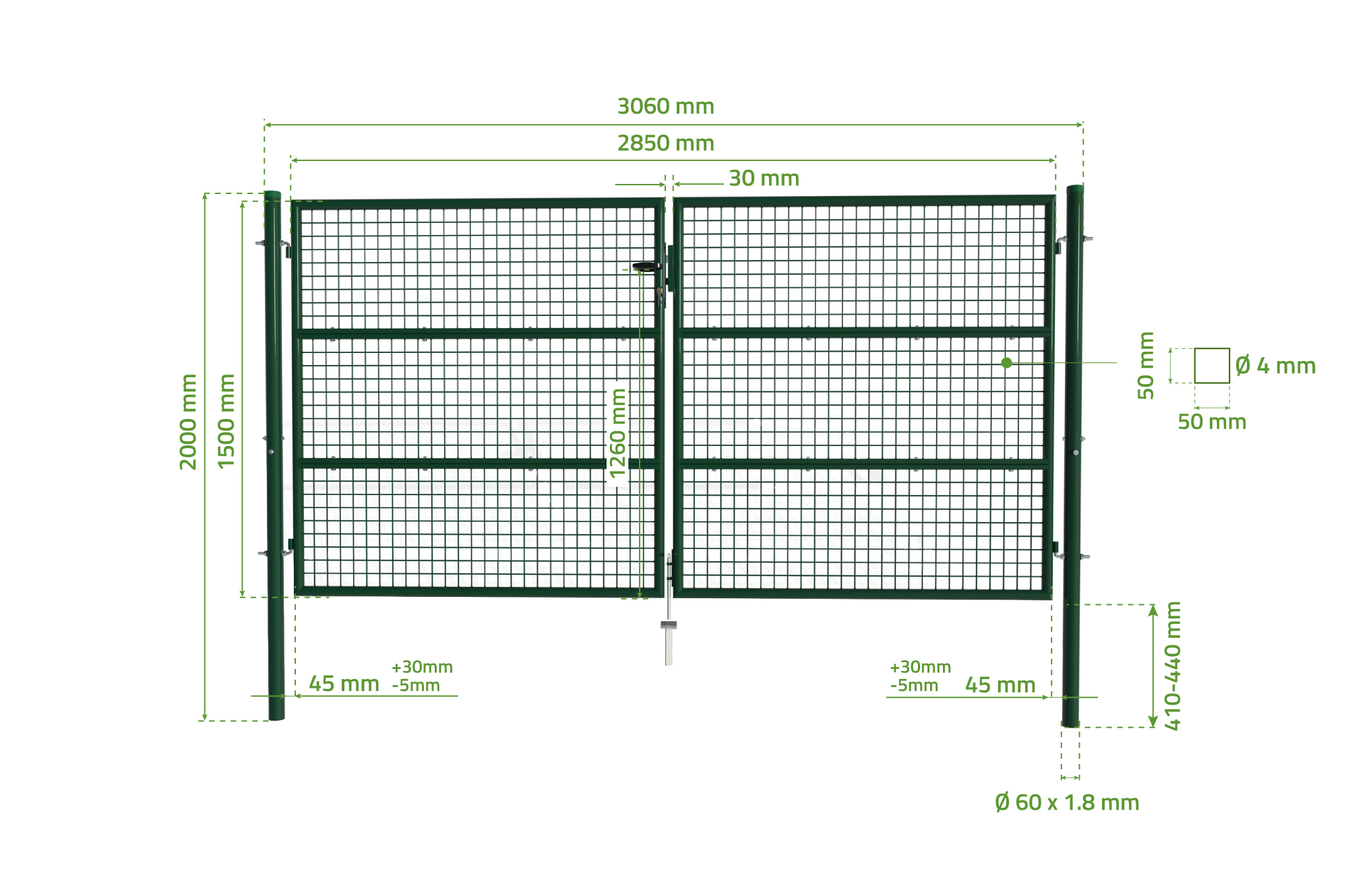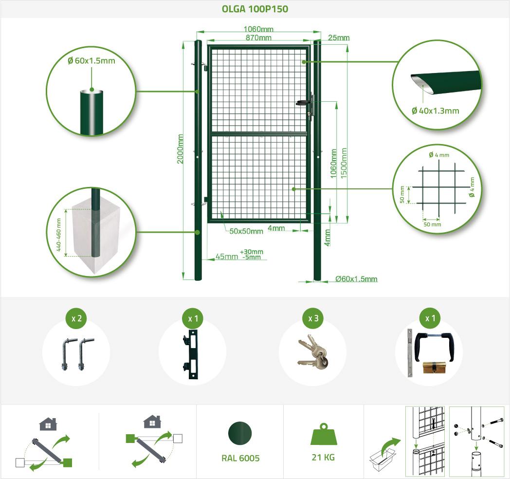 | Libellé | Pack portail battant grillagé OLGA 300B150 + Portillon 1m VERT, avec poignée, serrure et clé |