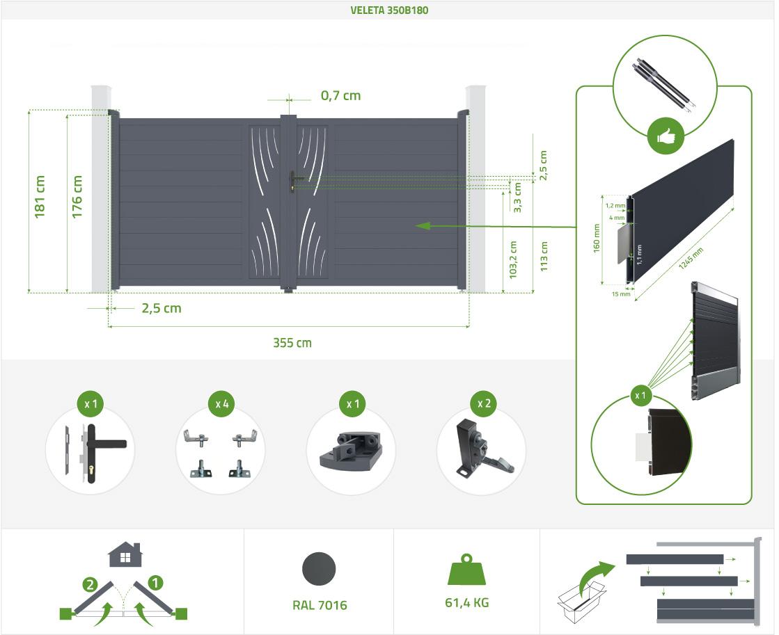 | Libellé | Pack portail battant VELETA 350B180 + Portillon VELETA 100P180 Gris |