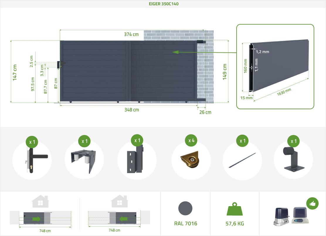 | Libellé | Pack portail coulissant 3,5m EIGER 350C140 + Portillon EIGER 100P140 Gris |