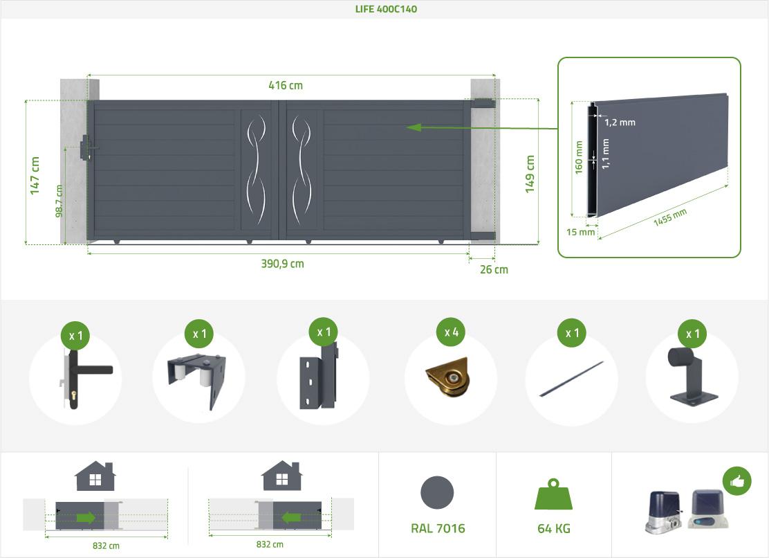 | Libellé | Pack portail coulissant 4m LIFE 400C140 + Portillon LIFE 100P140 Gris |