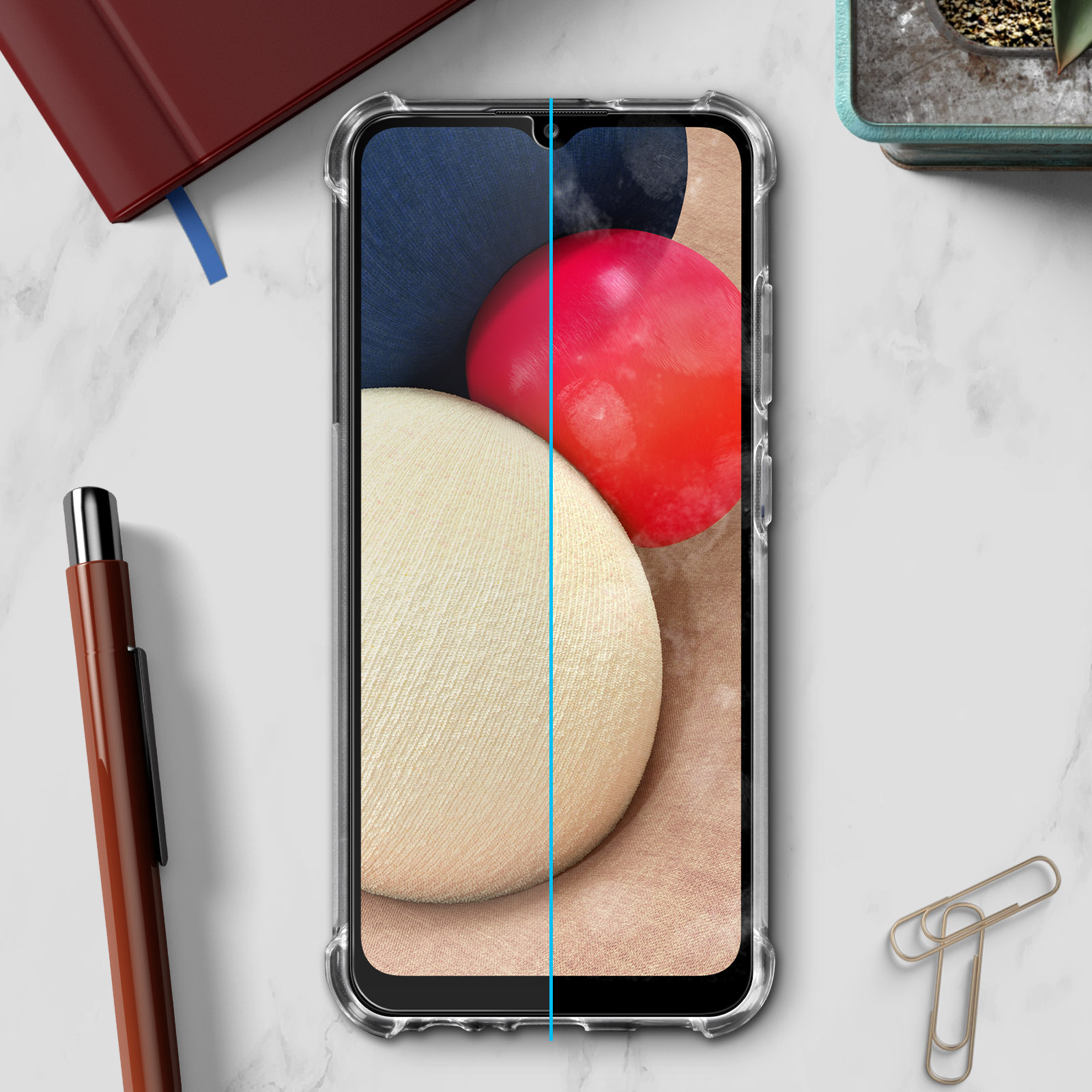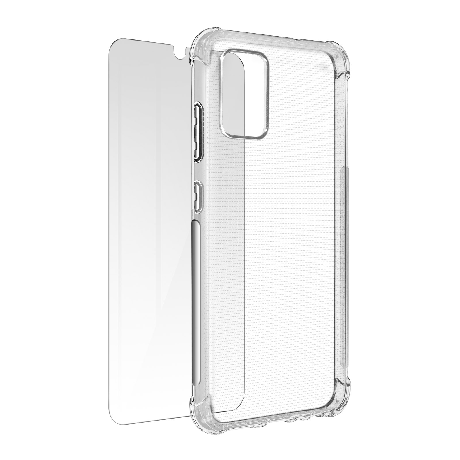 Pack protection 360° Premium pour Samsung Galaxy A02s. Coque silicone avec coins renforcés, laissant visible le design du mobile. Verre trempé 9H et anti-traces. Fin et transparent, propriétés de l'écran conservé. Fonctionnalités accessibles.
