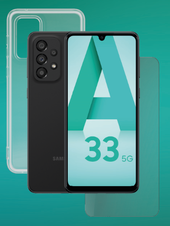 Pack Smartphone Samsung Galaxy A33 5G 128 Go Noir, Coque de Protection Transparente et Verre Trempé