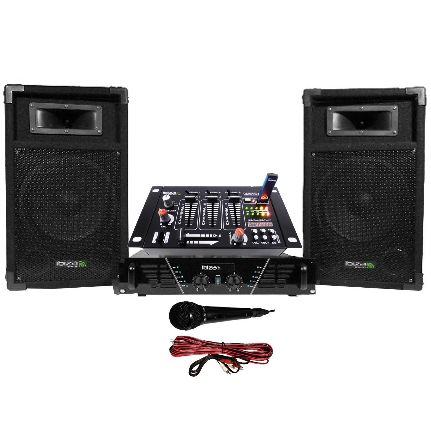 Pack de sonorisation DJ complet et prêt à brancher. Il est composé d'un ampli de 480 watts, d'une table de mixage IBIZA SOUND fiable et simple d'utilisation qui offre la possibilité de connecter une clé USB pour la lecture et le mix de vos MP3. Deux enceintes de sono, d'un micro et de tous les câbles nécessaires. Branchement sur PC possible.