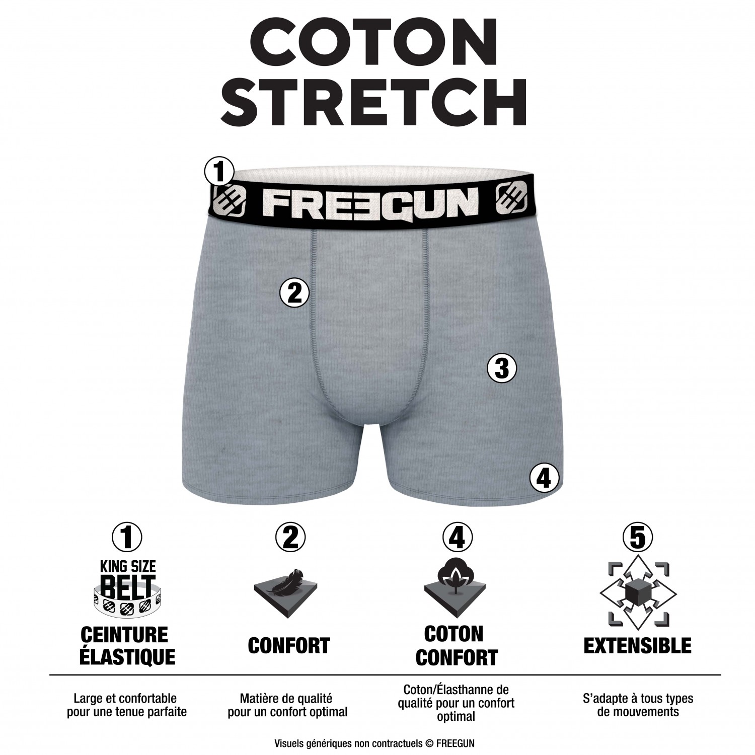 Pack de 5 boxers pour homme avec coloris et modèles aléatoires Freegun. Matière : Coton *Sélection de boxers aléatoire parmi les stocks disponibles, photos non contractuelles Modèle : Aléatoire
