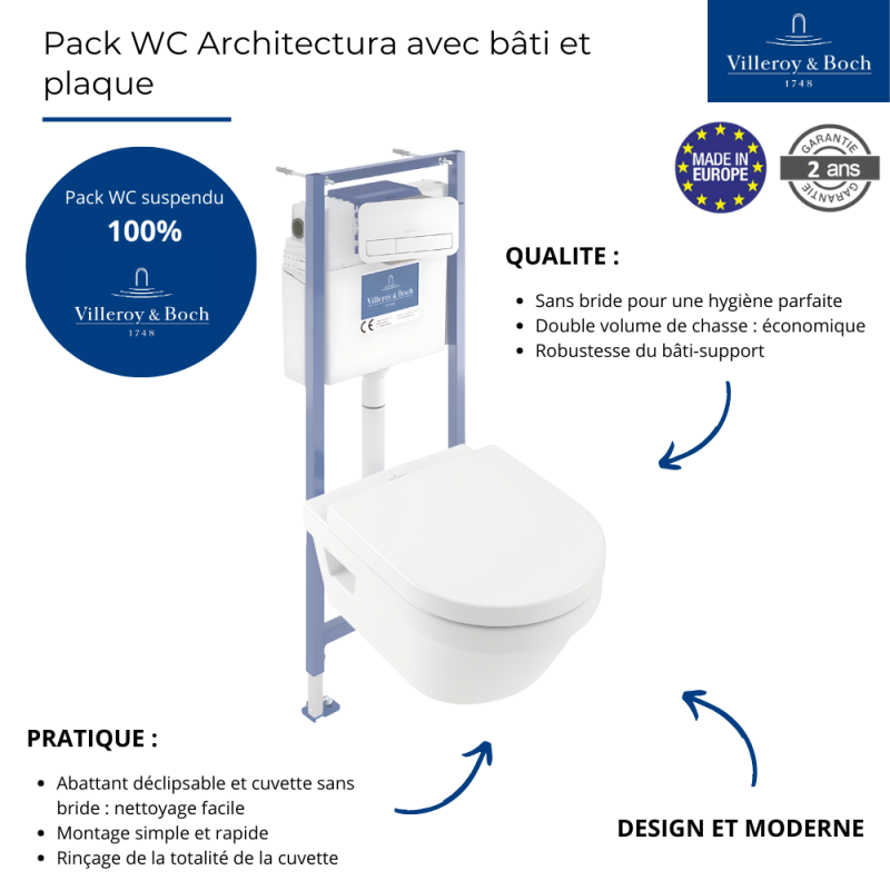 Avantages Pack WC sans bride VILLEROY ET BOCH Architectura avec abattant + bâti-support sol et mur Viconnect PRO + plaque
