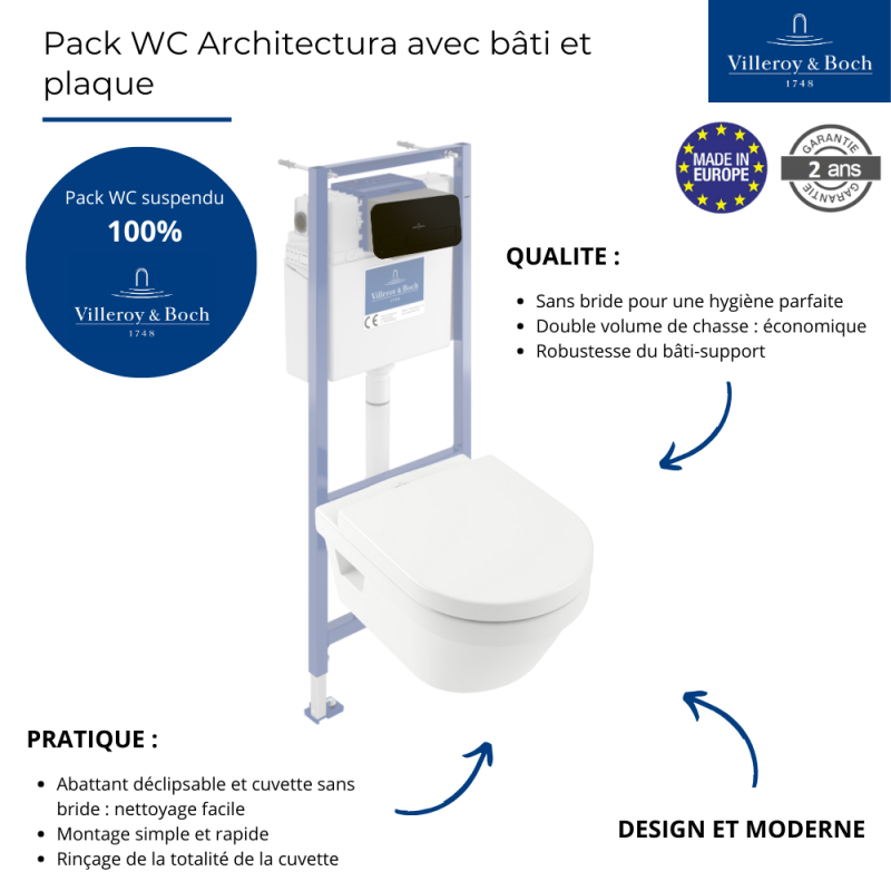 Avantages Pack WC sans bride VILLEROY ET BOCH Architectura avec abattant + bâti-support sol et mur Viconnect PRO + plaque