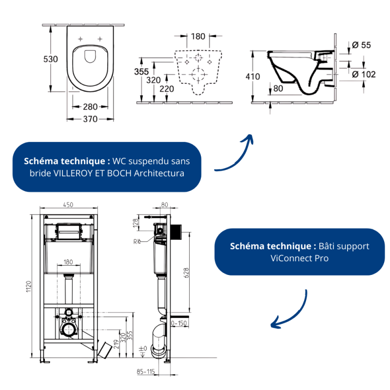 Avantages Pack WC sans bride VILLEROY ET BOCH Architectura avec abattant + bâti-support sol et mur Viconnect PRO + plaque