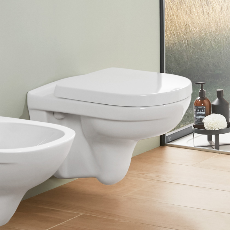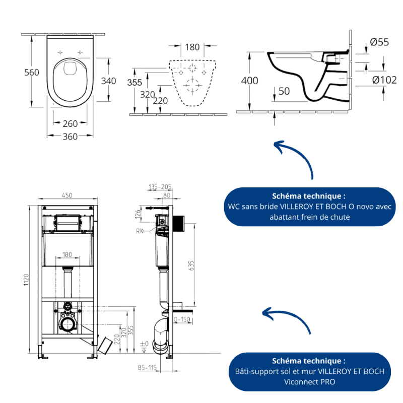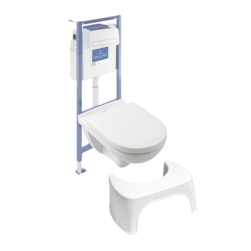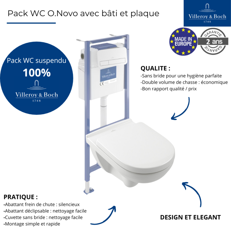 Libellé Pack WC sans bride VILLEROY ET BOCH O novo avec abattant frein de chute + bâti Viconnect PRO + plaque blanche + Tabouret blanc