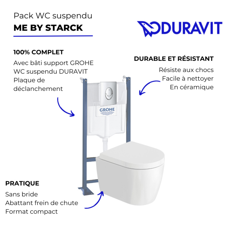 | Libellé | Pack WC suspendu sans bride compact DURAVIT Me by Starck + bâti support GROHE Rapid SL Projet + abattant + plaque blanc |