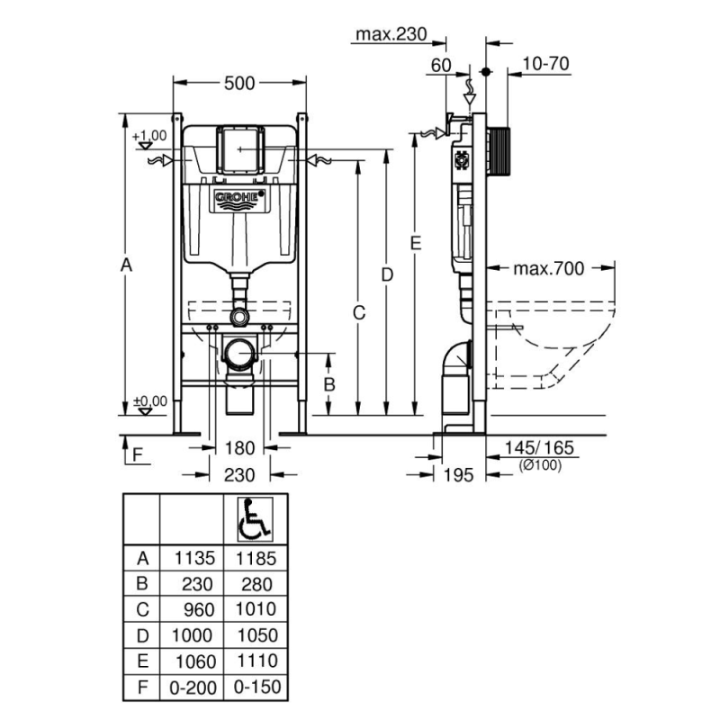 Caractéristiques techniques du bâti-support pour WC suspendu GROHE: