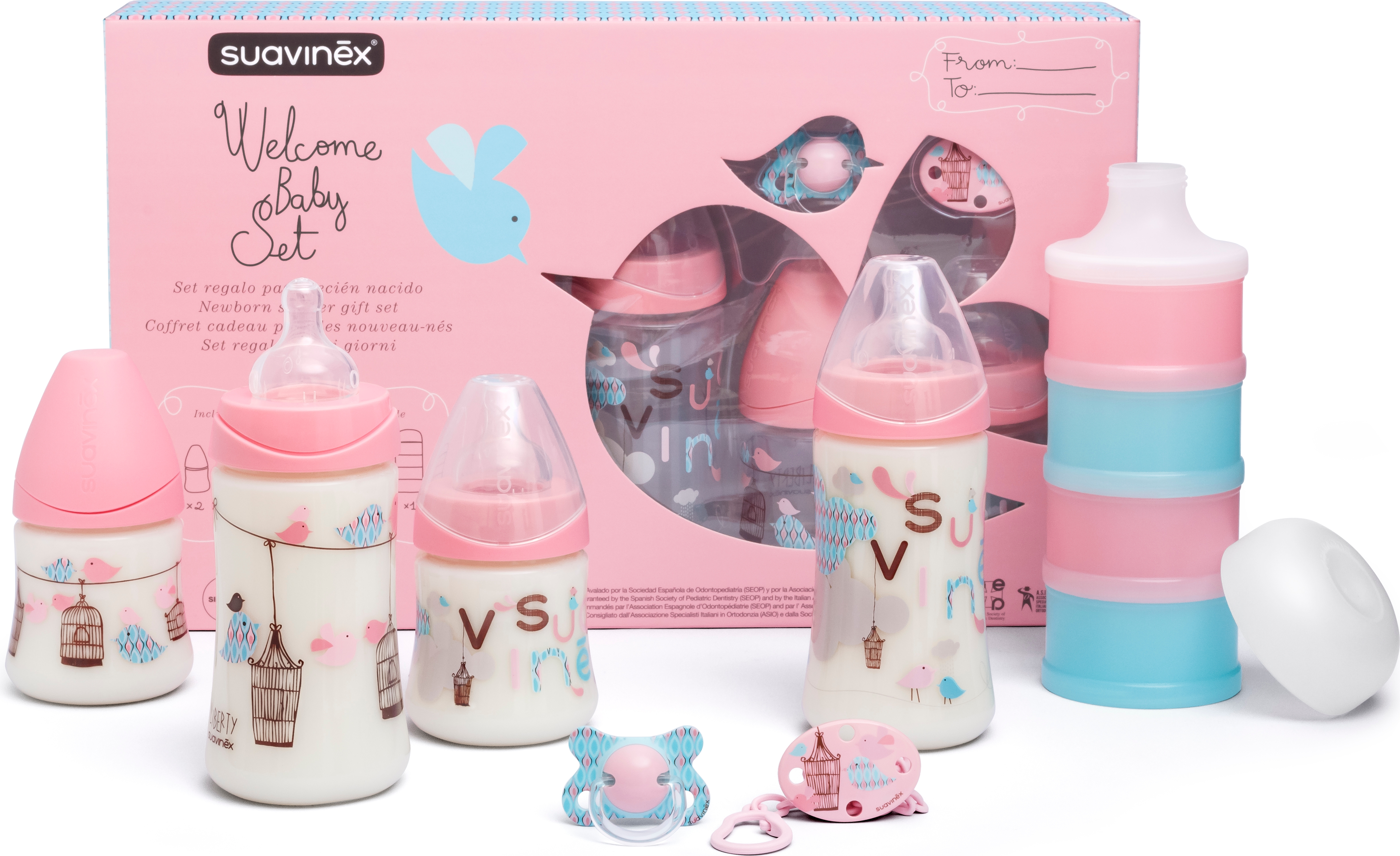 Un coffret bien pensé, il contient le nécessaire pour les premiers mois de bébé. A offrir en cadeau de naissance ! Contenu : - 2 biberons 150ml avec tétine ronde à débit lent spécial nouveau-né - 2 biberons 270ml avec tétine ronde 3 vitesses - 2 sucettes avec tétine anatomique en silicone - 1 attache-sucette - 1 doseur de lait 4 compartiments