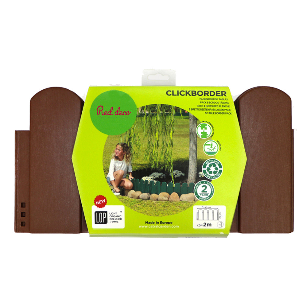 - CARACTÉRISTIQUES : pack 5 bordures de jardin; forme : plat; coloris : marron; matériau : LOP sont fabriqués à partir de composants recyclés et organiques; dimensions 1 bordure : 40 x 20 cm; longueur totale avec 5 bordures : 2 m; très résistant contre l'humidité et les rayons UV; bordure clipsable (clickborder).