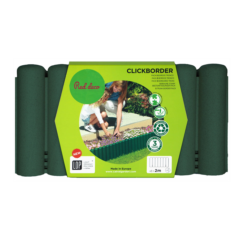 - CARACTÉRISTIQUES : pack 5 bordures de jardin; forme : rond; coloris : vert; matériau : LOP sont fabriqués à partir de composants recyclés et organiques; dimensions 1 bordure : 40 x 20 cm; longueur totale avec 5 bordures : 2 m; très résistant contre l'humidité et les rayons UV; bordure clipsable (clickborder).