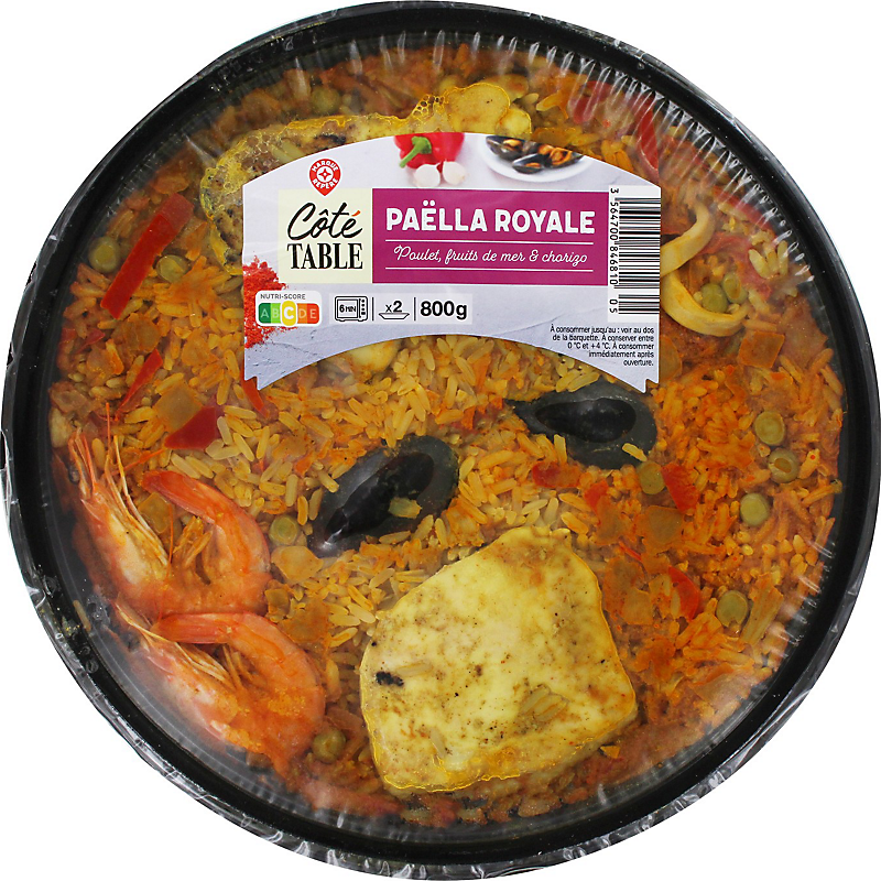 | Origine des principaux ingrédients | POULET ORIGINE : EUROPE, RIZ ORIGINE : AMERIQUE DU SUD, ASIE ET/OU EUROPE*, MOULE ENTIERE ELEVEE AU : CHILI, DANEMARK ET/OU IRLANDE*, POIVRON ORIGINE : EUROPE, CREVETTE ELEVEE EN : AMERIQUE ET/OU EUROPE*, PETIT POIS ORIGINE : BELGIQUE ET/OU FRANCE*, PORC ORIGINE : EUROPE * SELON LES APPROVISIONNEMENTS ET/OU LES CARACTÉRISTIQUES GUSTATIVES RECHERCHÉES |