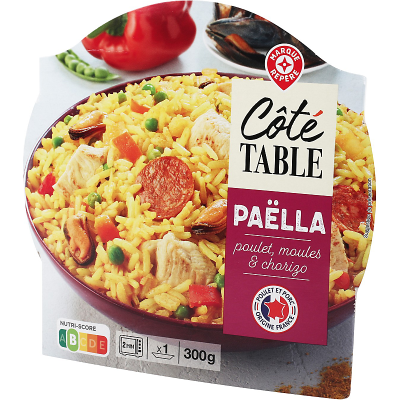 Ingrédients: Riz cuit 54 % (riz long grain, eau), viande de poulet traitée en salaison et précuite 15 % (viande de poulet, eau, amidon de maïs, sel, fibre de blé, stabilisant : E451), moules du Pacifique décoquillées précuites 8 %, poivrons 6 %, petits pois 5,3 %, oignons, chorizo 3,3 % (viande de porc, gras de porc, piments, sel, dextrose, plantes aromatiques, ferments), huile de colza, arômes naturels (dont blé, poissons), plantes aromatiques, sel, épices.