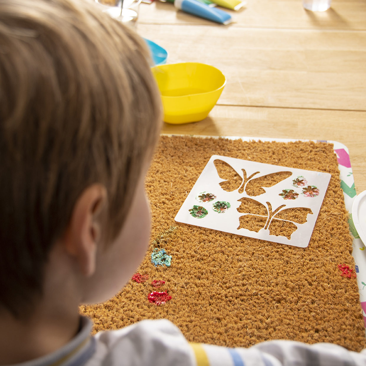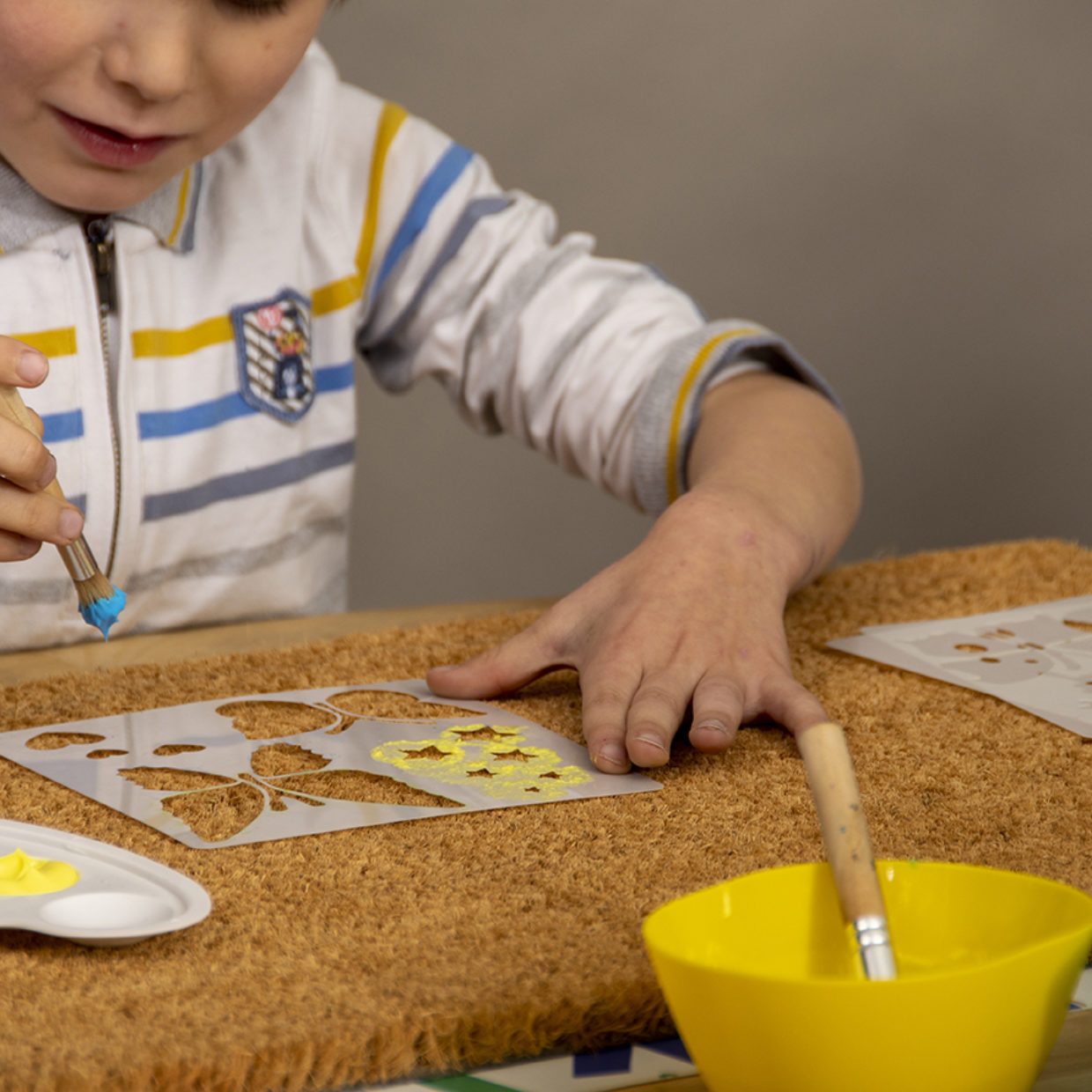 | Composition | Paillasson en fibre de coco + feuilles de pochoir + pinceau + peinture pour paillasson |