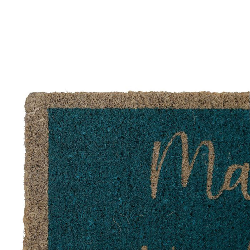 Devant une porte d'entrée, ce paillasson bleu en coco apporte une note décorative originale et tendance, renforçant l'esprit vacances et détente.
