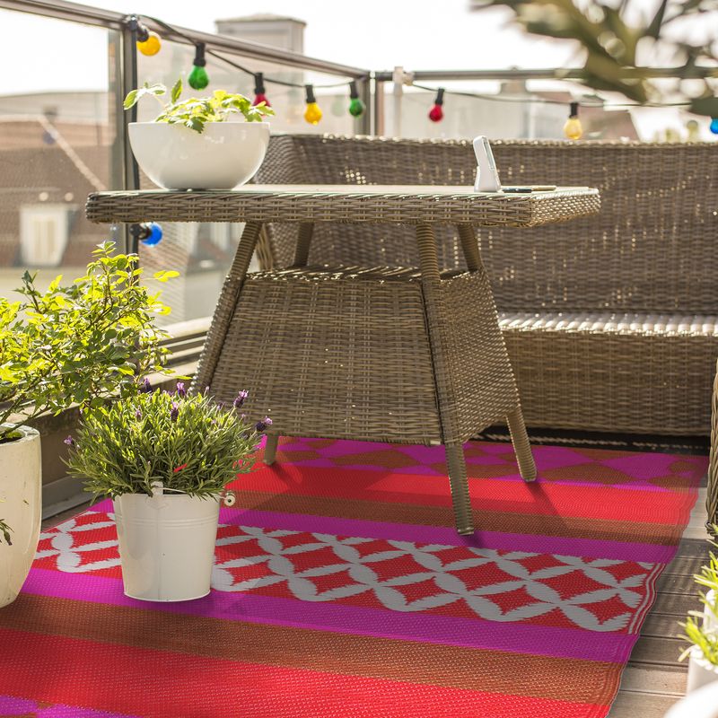 Un beau et grand tapis aux décors inspirés de l'Inde modernisée, pouvant être mis aussi bien à l'intérieur qu'à l'extérieur. Résistant et facile d'entretien, ce tapis aux couleurs lumineuses mettra une belle note exotique et chaleureuse dans votre salon ou sur votre terrasse.