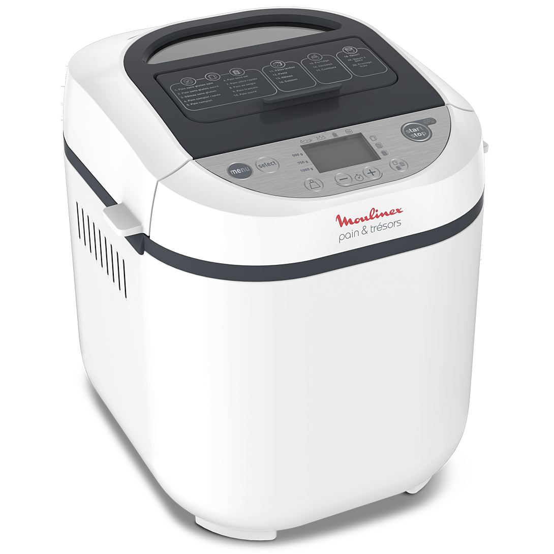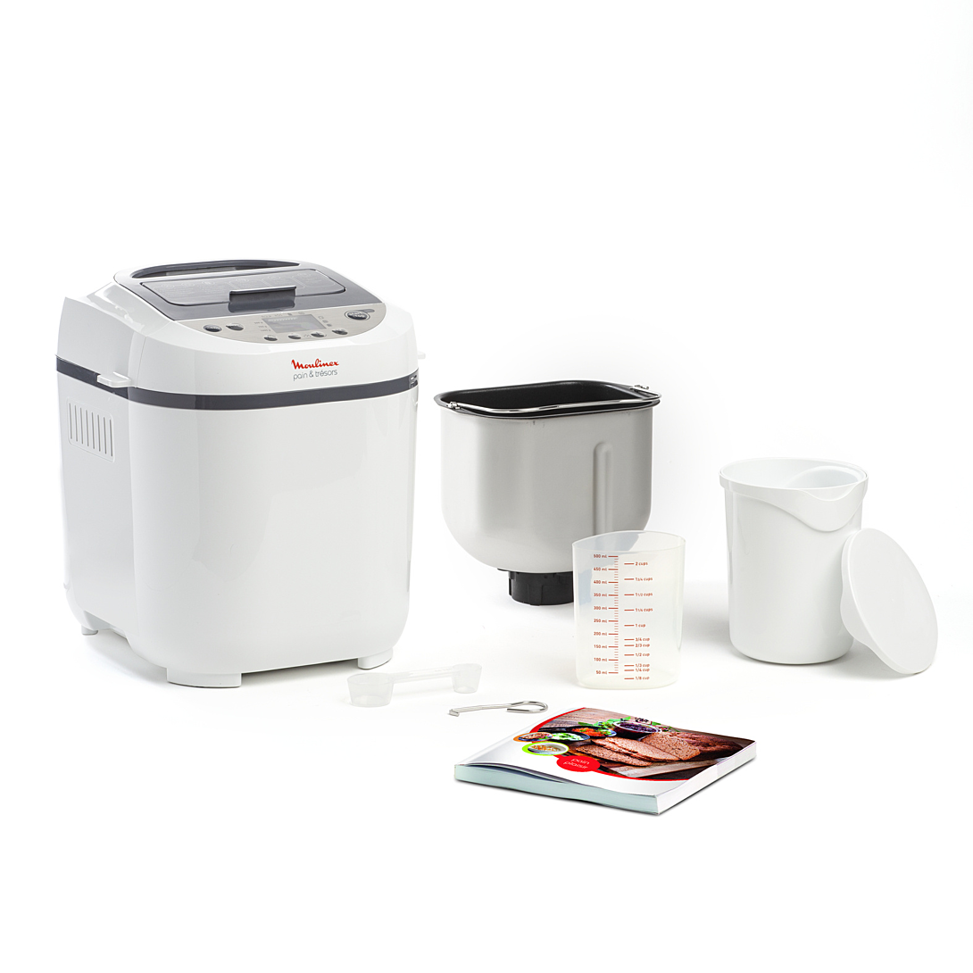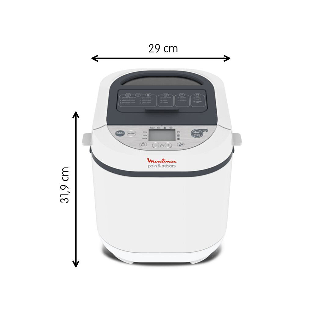 Le goût du fait maison grâce à pain & trésors et ses 20 programmes automatiques pour réaliser facilement du pain fait maison et bien plus encore : cake, pasta, pâte à pizza, confiture, porridge, céréales, yaourt, yaourt à boire et fromage frais. 3 programmes sans gluten inclus. 3 programmes sans gluten : pain sans gluten salé / pain sans gluten/ sans gluten gâteau 7 programmes de pain : pain complet rapide / pain complet / pain sans sel / pain rapide / pain de seigle /pain français / pain au lait 3 programmes laitiers : Yaourt/yaourt à boire / Fromage blanc Personnalisez vos préparations grâce au distributeur automatique. : levure, raisins secs, noix, pépites de chocolat.