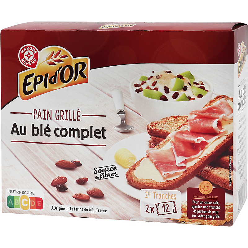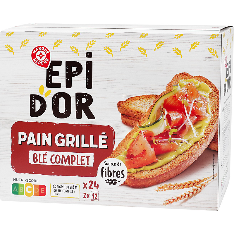 Ingrédients : Farine de blé 62,6 %, farine de blé complet 28,3 %, huile de tournesol, levure, sucre, sel, farine d'orge maltée torréfiée, agent de traitement de la farine : acide ascorbique, enzymes (dont blé).