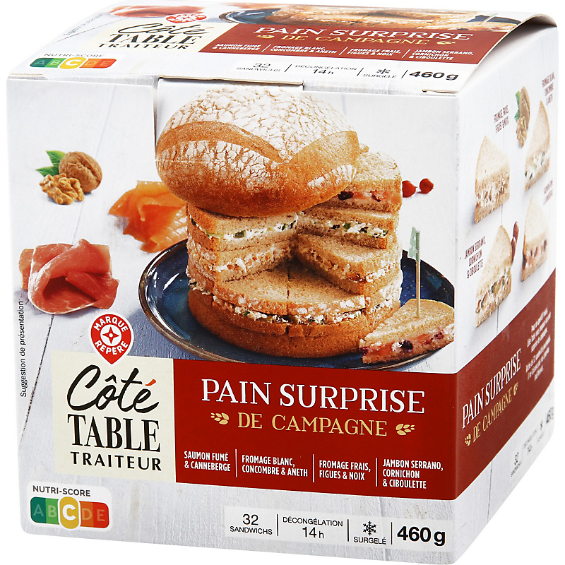 Pain de campagne découpé en 32 sandwichs - surgelé 8 Sandwichs au saumon fumé et canneberges 8 Sandwichs au fromage blanc, concombre et aneth 8 Sandwichs au fromage frais, figues et noix 8 Sandwichs au jambon Serrano, cornichon et ciboulette COTE TABLE