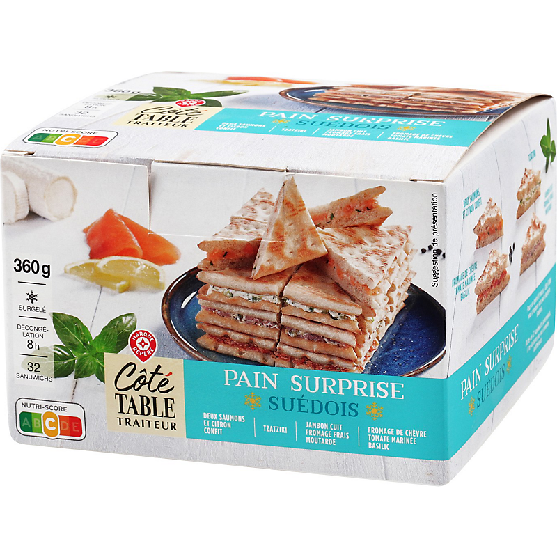 Pain spécial (suédois) 63 % (farine de blé ; eau ; sucre ; farine de seigle ; levure ; huile de colza ; sel ; levain de seigle dévitalisé ; émulsifiants : E471, E472e ; gluten de blé ; poudre à lever : E503ii ; agent de traitement de la farine : acide ascorbique) ; fromage blanc 9 % ; fromage de chèvre au lait pasteurisé 5,3 % ; crème fraîche ; tomates semi-déshydratées marinées 3,6 % (tomate semi-déshydratée, huile de colza, origan, sel, ail, jus de citron concentré) ; jambon cuit au torchon 2,7 % (jambon de porc, sel, bouillons (eau, protéines de porc, bouillon de porc, sel), arômes naturels, dextrose, antioxydant : E316, conservateur : E250) ; saumon fumé 2,6 % (saumon (Salmo salar), sel) ; concombre 2,3 % ; saumon cuit 2 % (Salmo Salar) ; fromage frais 1,8 % ; moutarde à l'ancienne 0,7 % (vinaigre d'alcool, graines de moutarde 0,2 %, eau, sel, sucre, arôme naturel, acidifiant : acide lactique, conservateur : disulfite de potassium) ; écorce de citron confit 0,6 % (écorce de citron 0,4 %, sucre, jus de citron concentré) ; cornichon au vinaigre 0,5 % (cornichon, eau, sel, vinaigre d’alcool) ; ciboulette ; sel ; miel ; amidon modifié de tapioca ; épaississants : farine de graines de caroube, gomme xanthane ; protéines de lait ; basilic 0,05 % ; jus de citron concentré ; aneth 0,04 % ; ail ; persil ; poivre.