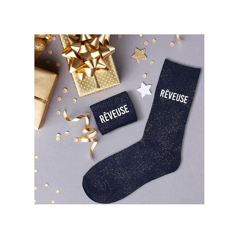 Paire de chaussettes pailletées rêveuse Couleur : Bleu marine avec motifs scintillants Matière : 55% coton, 32% polyester, 11% fibre métallisée Taille : Unique (36-42) Description : Laissez parler votre imagination avec ces chaussettes pailletées bleu marine. Arborant l'inscription "rêveuse", elles allient douceur et élégance pour un style discret mais raffiné.