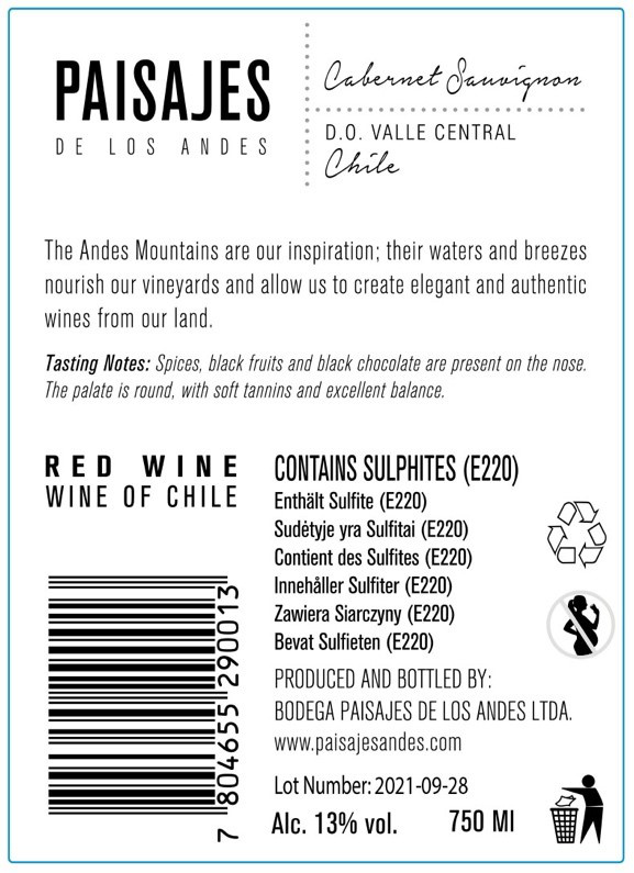| Libellé | Paisajes de los Andes, 2021 - Valle Central DO, CHILI - Rouge - 75 cl |