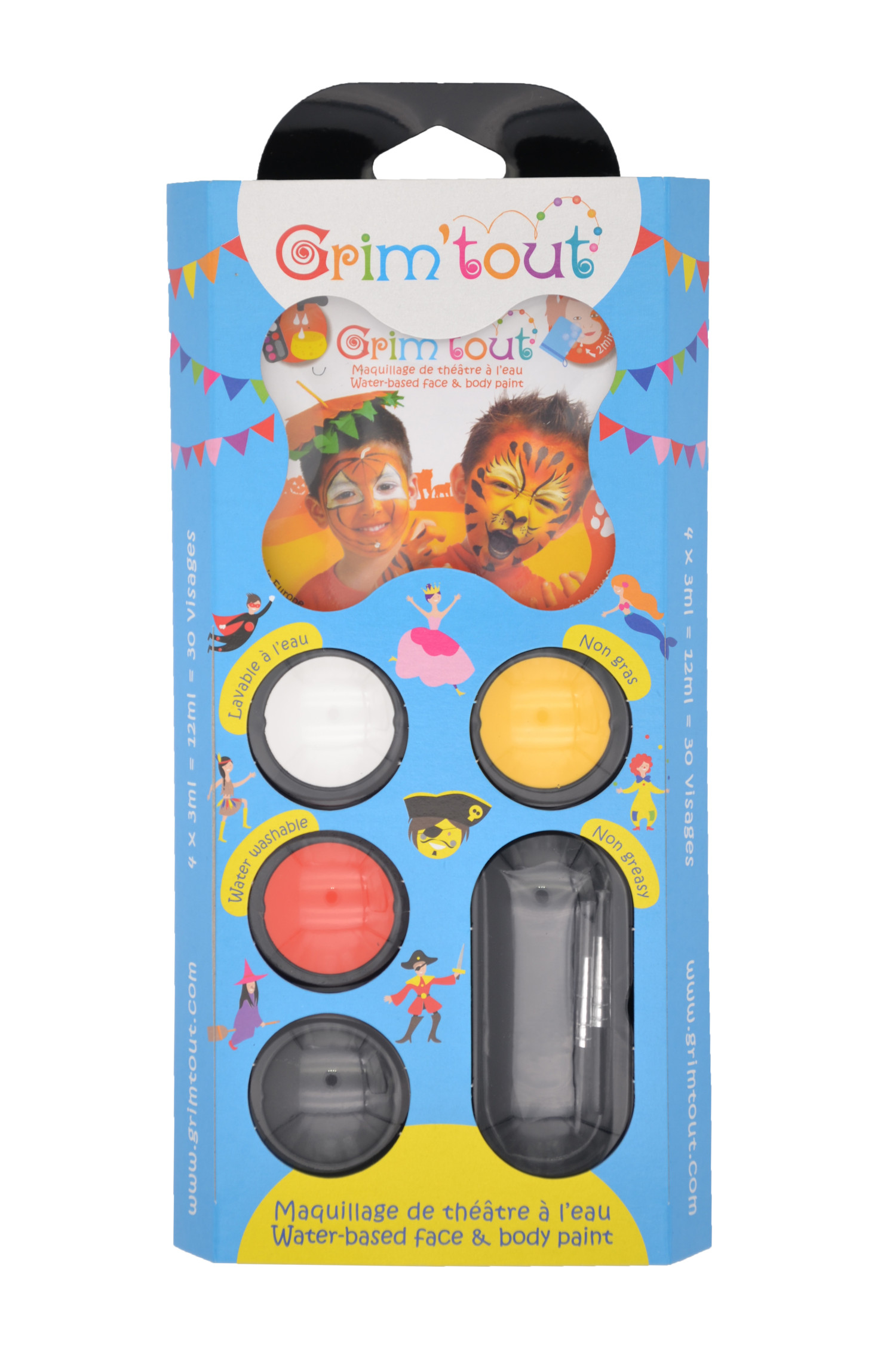 Faire un maquillage de tigre est sans doute l'un des maquillages les plus amusants à réaliser ! Dans ce set de 4 couleurs, vous aurez tout ce qu'il vous faut pour vous transformer en félin rugissant : blanc, jaune, orange et noir, les couleurs de votre tigre mais aussi une éponge pour faire les aplats et le dégradé de couleurs et un pinceau pour les détails. Vous aurez au total 12 ml de couleur, soit environ 30 maquillages. Le maquillage GRIM'TOUT est formulé à base d'eau, sa texture est non grasse, cela permet une application aisée et un démaquillage facile à l'eau et au savon. Se conserve 18 mois après ouverture. Couleurs : blanc, jaune, orange, noir